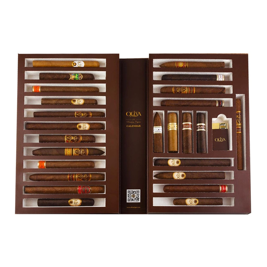 Dans ce calendrier pas comme les autres se cache une collection exquise de 25 cigares soigneusement sélectionnés et dévoilant chacun un nouveau profil aromatique et un savoir-faire artisanal inégalé. Un briquet Oliva se cache également derrière l'une des fenêtres.