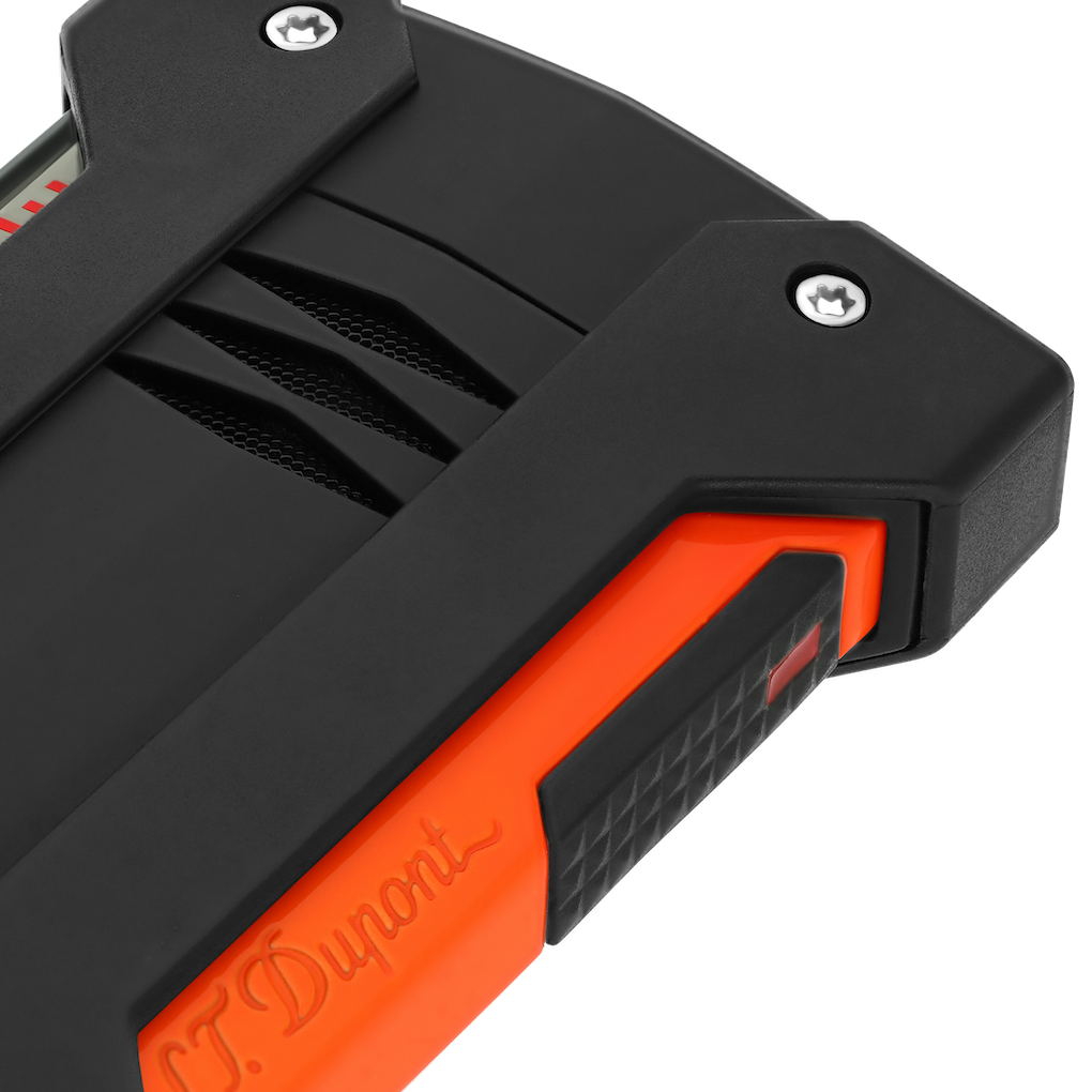Ce briquet S.T. Dupont Défi Extrême noir est mat et arbore une gâchette orange fluo. Il associe un corps en métal injecté à une enveloppe de protection noire semi-rigide très résistante.