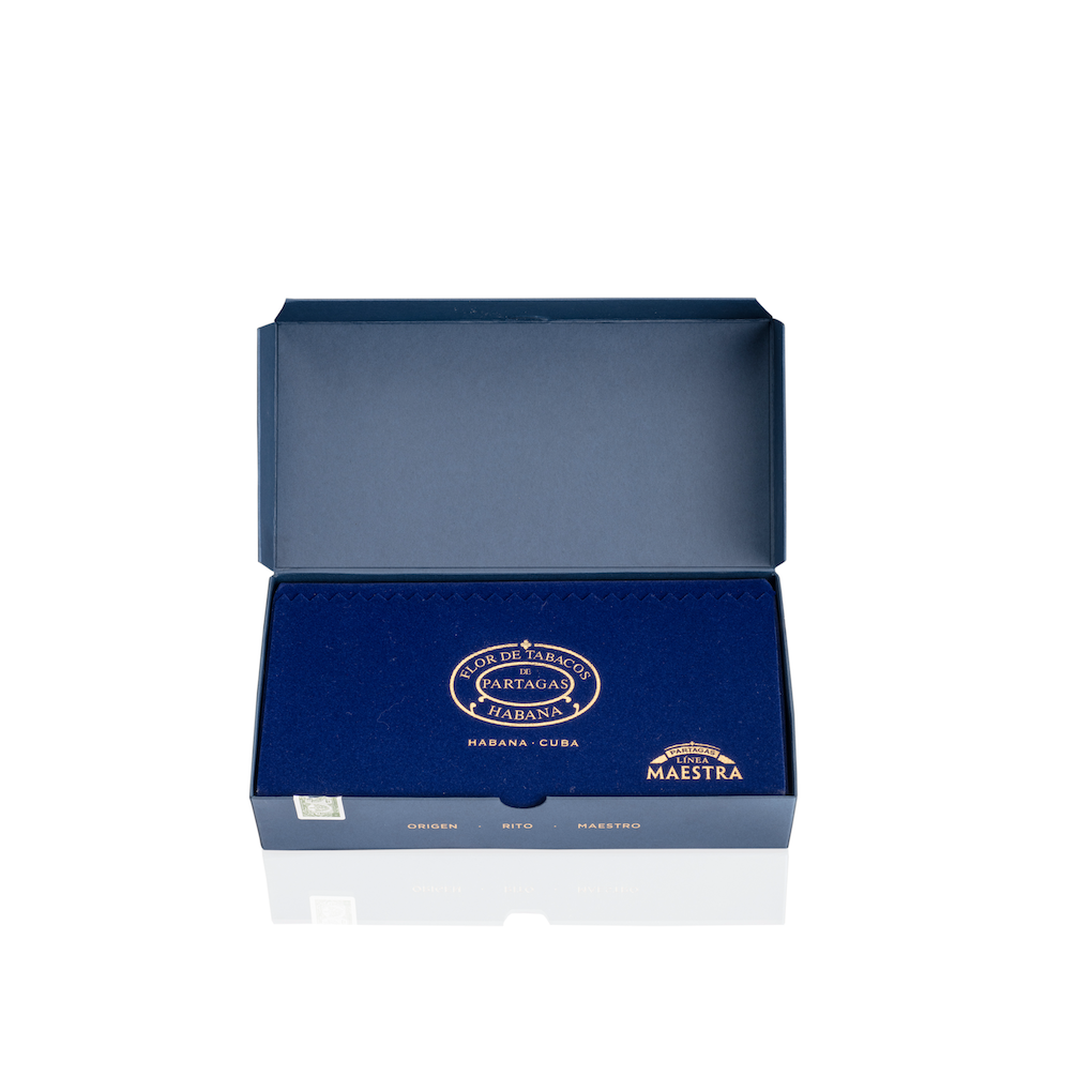 Voici réunies en un très joli coffret bleu les trois nouvelles vitoles de la Linea Maestra de chez Partagas, présentées lors du Festival del Habano 2023: Rito (ring 52), Origen (46) et Maestra (46).