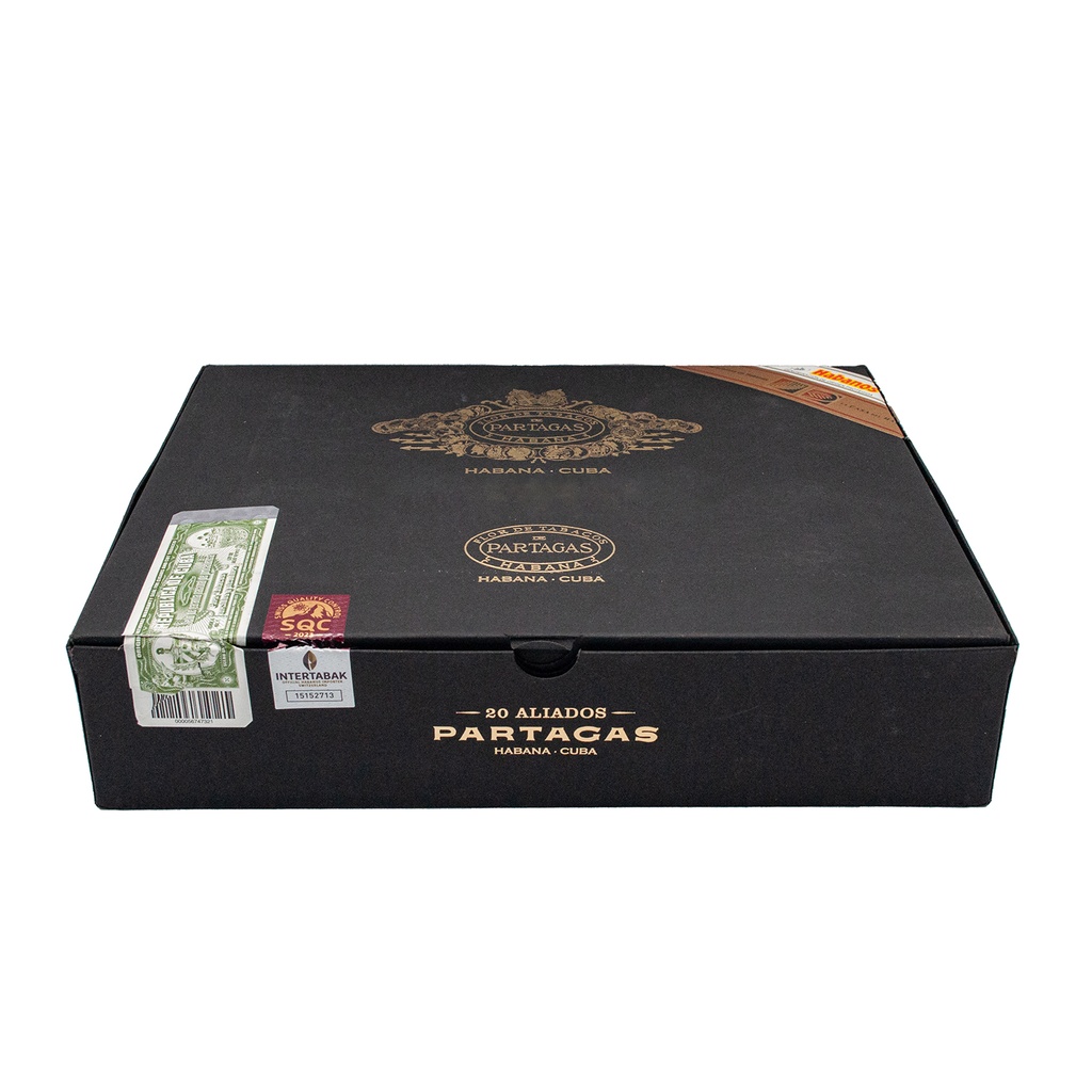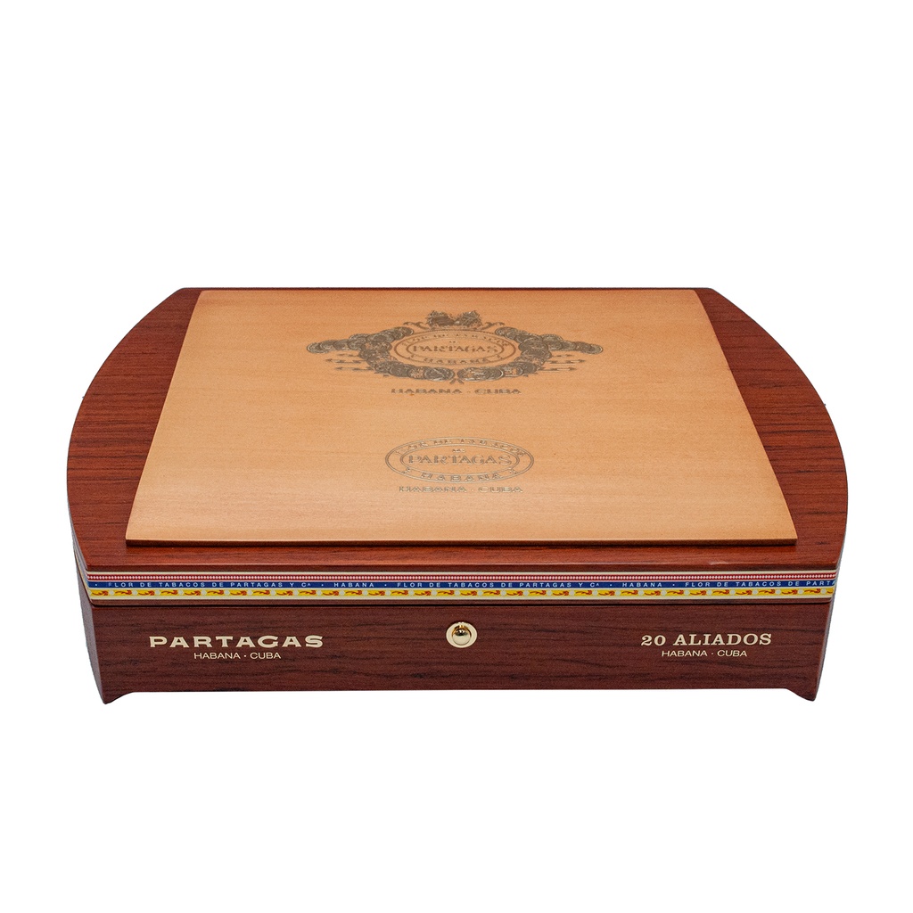Les Partagas Aliados sont présentés dans un luxueux coffret en bois de 20 unités, recouvert d’une laque transparente et orné de magnifiques décorations Partagas sur le pourtour.