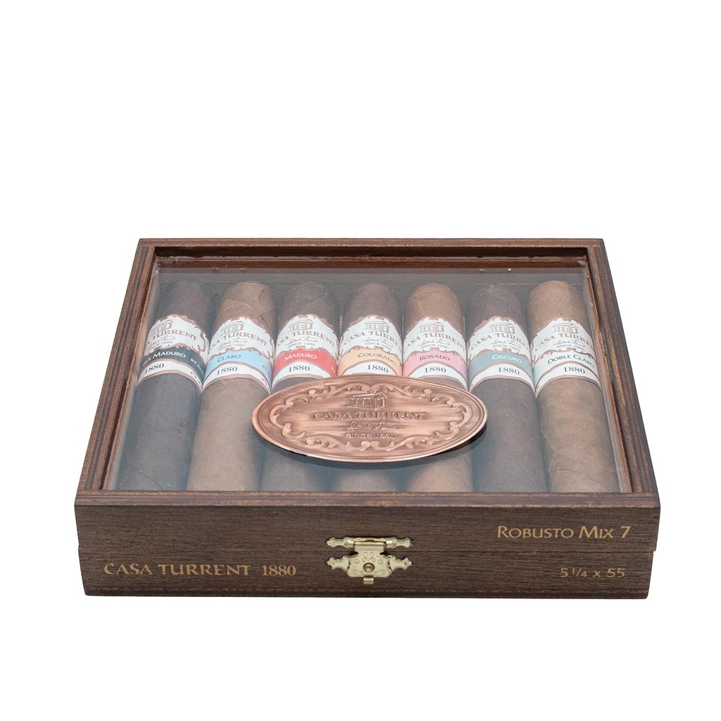 Cette boîte de dégustation Casa Turrent, avec son couvercle en plexiglas, permet de découvrir les sept assemblages de la ligne 1880 au format Robusto: Claro, Colorado, Oscuro, Maduro, Rosado, Doble Claro et Doble Maduro.