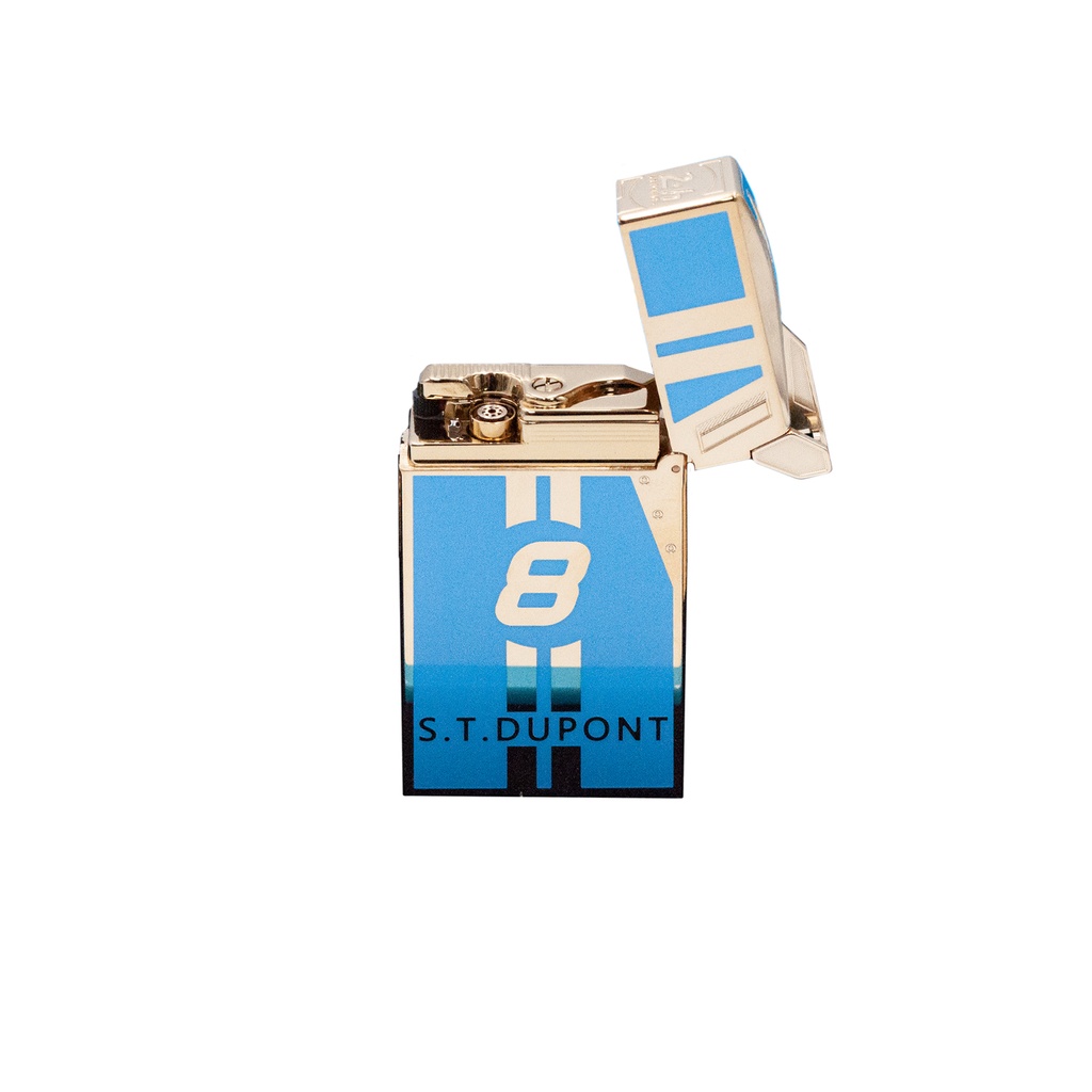 Ce coffret, avec comme support décoratif une voiture de compétition reprenant les codes de la maison, contient un briquet Le Grand Dupont et un porte-clés casque de course aux finitions dorées. La laque bleue et les finitions or jaune du briquet sont un hommage aux couleurs du circuit (bandes et vibreurs placés sur la piste) mais aussi le symbole du jour et de la nuit pour cette course de 24 heures. Le chiffre 8 présent à différents endroits sur le coffret est un porte bonheur mais également un clin d’œil à l’adresse de la première boutique de la maison à Paris, au 8 rue Dieu.