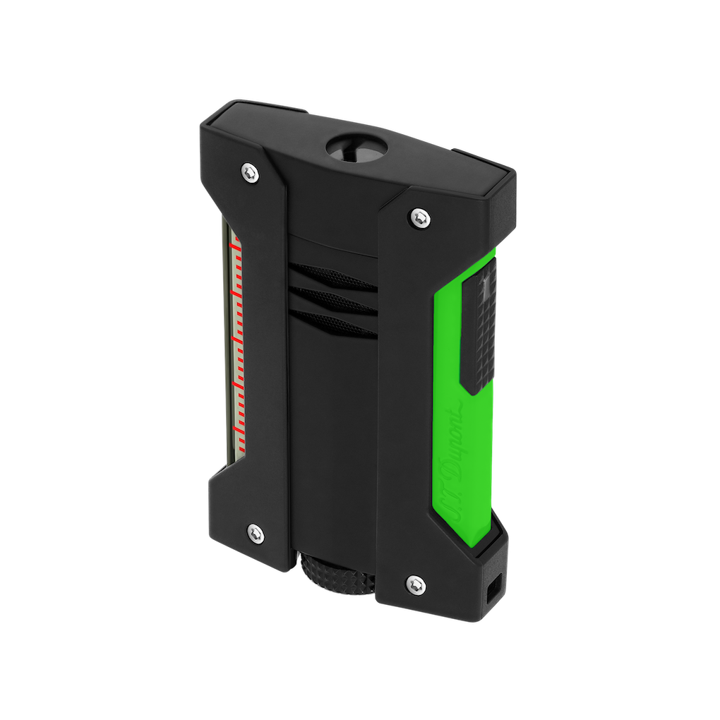 Ce briquet S.T. Dupont Défi Extrême noir est mat et arbore une gâchette vert fluo. Il associe un corps en métal injecté à une enveloppe de protection noire semi-rigide très résistante.