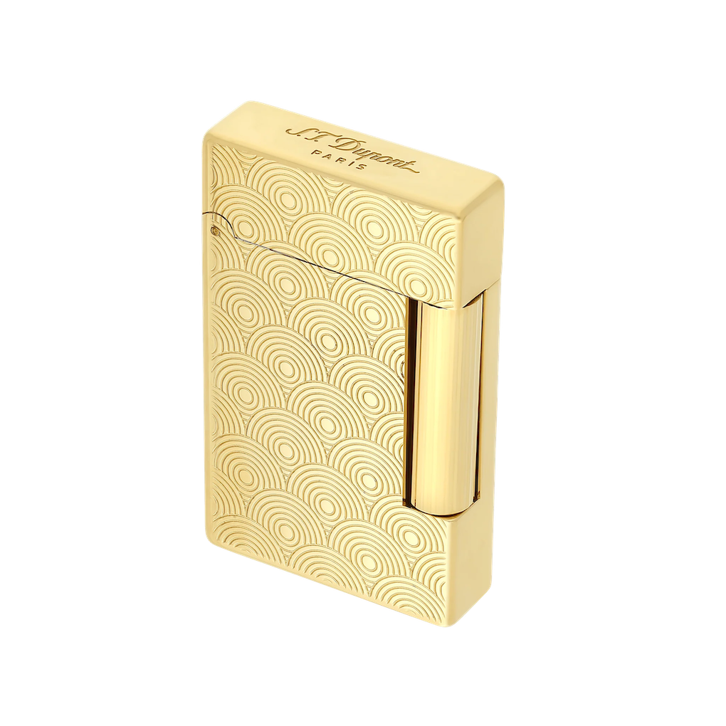 Briquet S.T. Dupont Initial, décor guilloche "cinatique", finitions dorées. Doté d'une double flamme jaune.Pierre à briquet associée: rougeRecharge de gaz associée: bleu