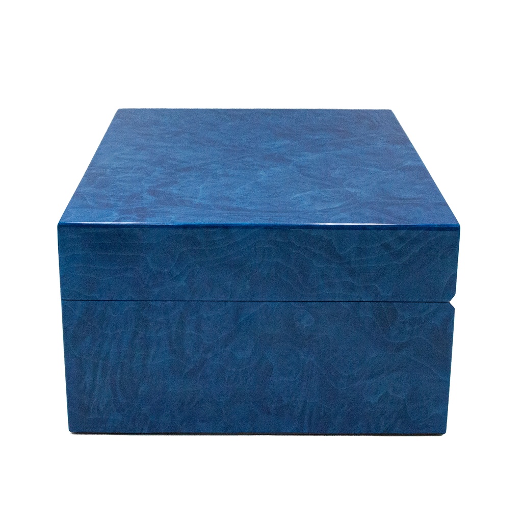 Les caves à cigares Gentili sont réalisées en bois massif, avec comme il se doit un intérieur en cèdre espagnol. Elles comportent un hygromètre analogique, ainsi que des charnières métalliques et une fermeture de superbe qualité. Cette cave bleue en arbousier peut contenir une vingtaine de cigares au format Corona.