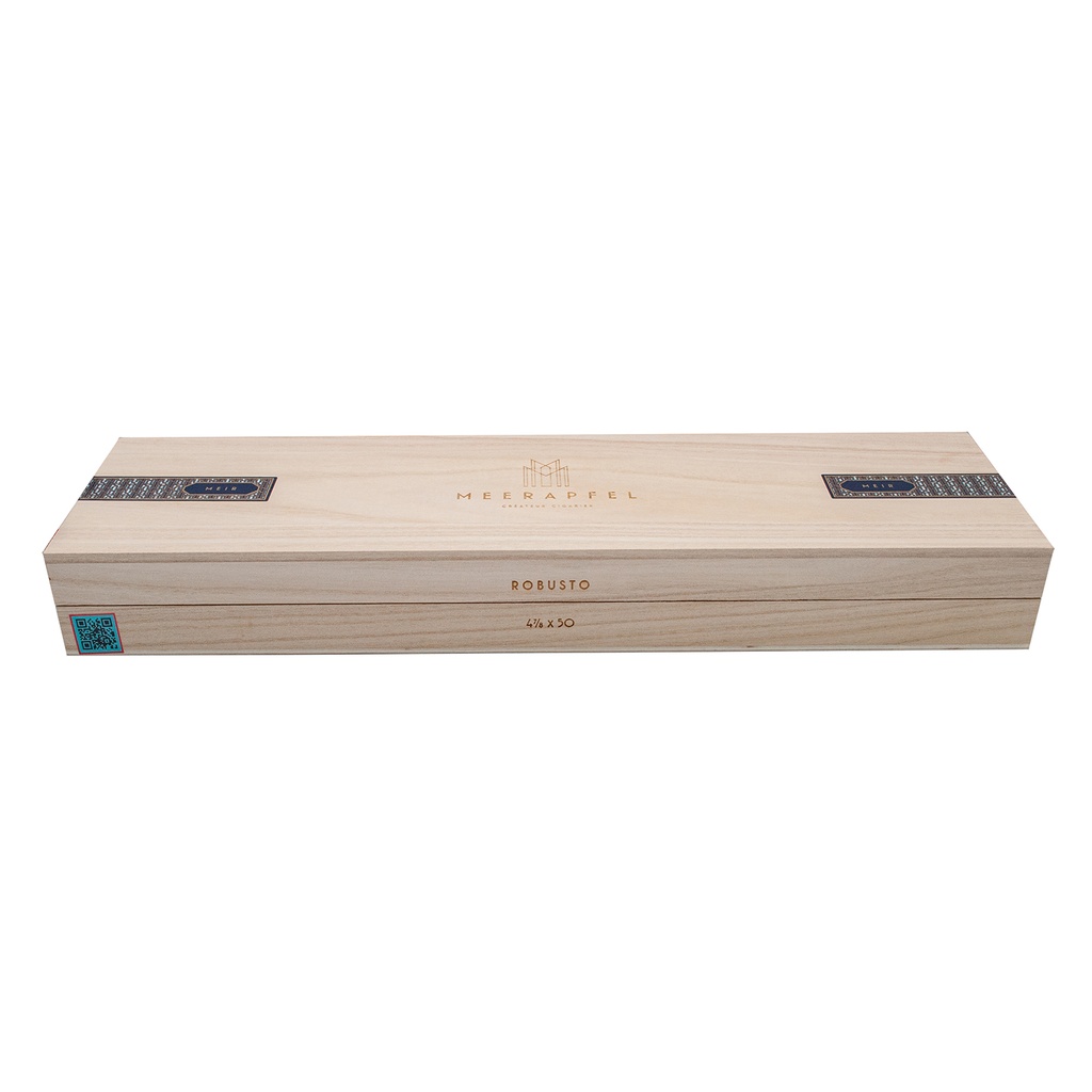 MEIR est le second Master Blend de chez MEERAPFEL Cigar après RICHARD et prend la forme de quatre nouveaux modules: Robusto, Double Robusto, Churchill et Pyramid. Meir Meerapfel créa en 1876 la première fabrique de cigares de la famille, dans le village d'Untergrombach en Allemagne. Si la composition des Master Blend n’est jamais dévoilée, on sait cependant que la cape de ces vitoles provient de feuilles de tabac du Cameroun vieillies 20 ans! Le Double Robusto est présenté dans un magnifique coffret comprenant un cendrier bleu marine, dont huit exemplaires sont disponibles auprès de votre Tabashop.